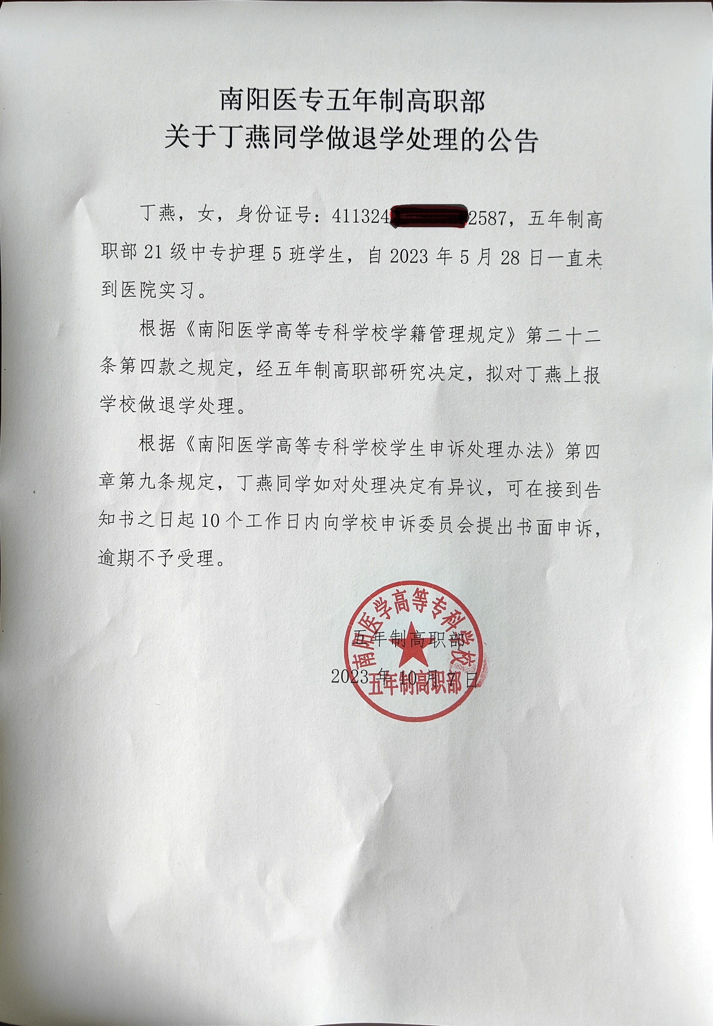 南阳医专五年制高职部关于丁燕同学做退学处理的公告 丁燕,女,身份证号:411324********2587,五年制高职部21级中专护理5班学生,自2023年5月28日一直未到医院实习。 根据《南阳医学高等专科学校学籍管理规定》第二十二条第四款之规定,经五年制高职部研究决定,拟对丁燕上报学校做退学处理。 根据《南阳医学高等专科学校学生申诉处理办法》第四章第九条规定,丁燕同学如对处理决定有异议,可在接到告知书之日起10个工作日内向学校申诉委员会提出书面申诉,逾期不予受理。 南阳医专五年制高职部 2023年10月7日 ![]() 南阳医学高等专科学校成人高考网上报名入口 |