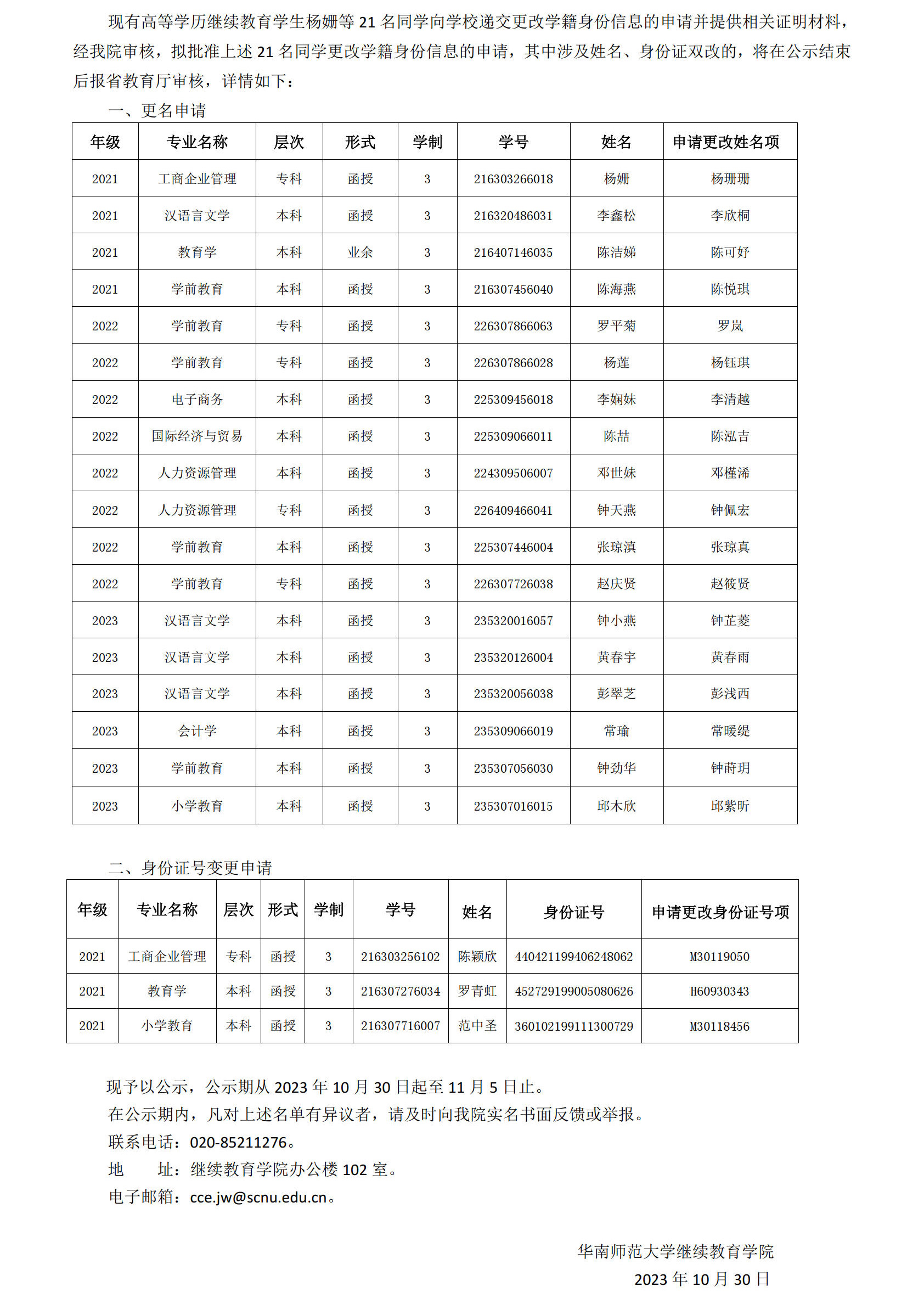 | 关于我校高等学历继续教育学生杨姗等21名同学申请变更学籍身份信息的公示 更新时间:2023/10/31 13:00:00 |