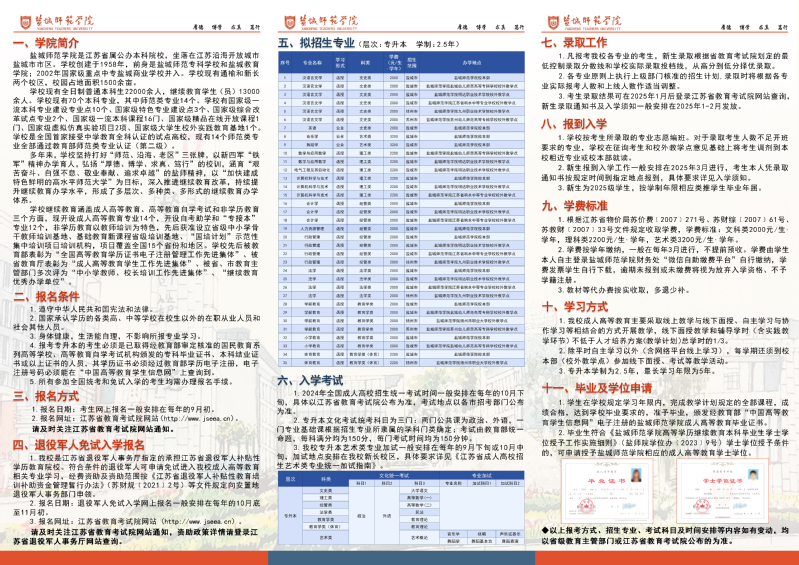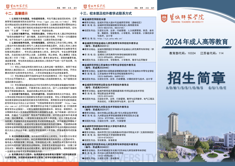 | 盐城师范学院成人高等教育2024年招生简章 更新时间:2024/6/19 9:42:00 |