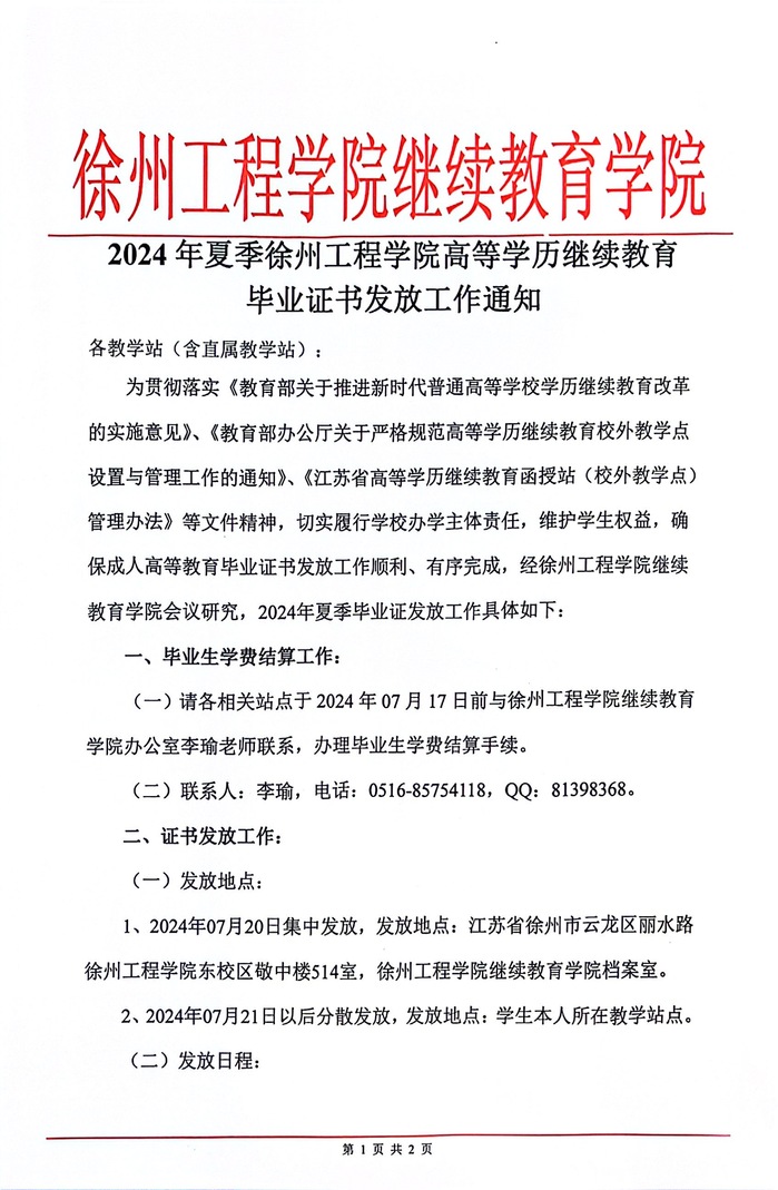 | 2024年夏季徐州工程学院高等学历继续教育毕业证书发放工作通知 更新时间:2024/7/18 10:41:00 |