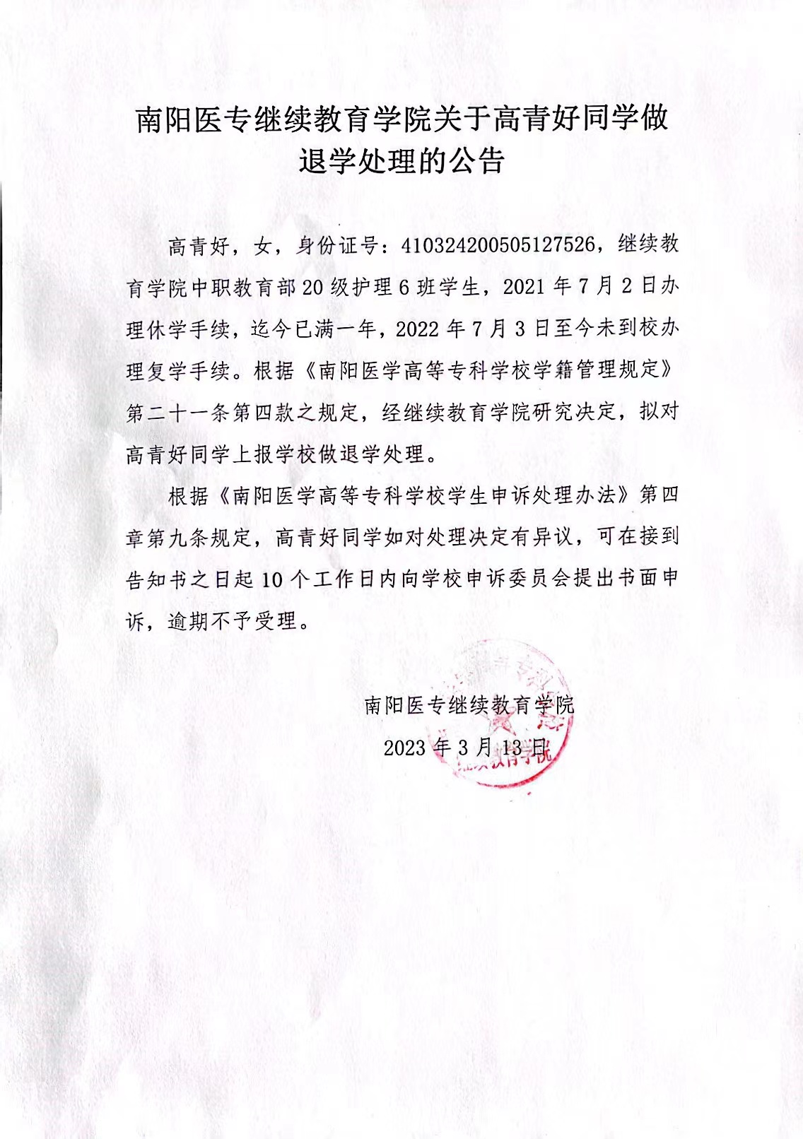 更新时间:2023/5/9 18:53:00 河南成人高考负责老师:王老师 手机:15515712010 南阳医专继续教育学院关于高青好同学做退学处理的公告